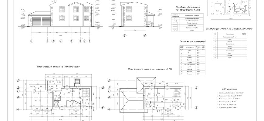 Архитектурные чертежи 2-х этажного коттеджа с гаражом в Автокаде