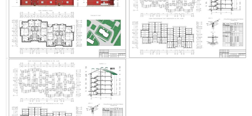 Чертежи 4-х этажного 2-х секционного жилого дома в Автокаде, в…