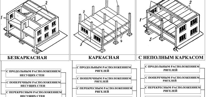 1 – несущие стены; 2 – плиты перекрытия; 3 – колонны; 4 – ригеля; 5 – ненесущие стены.