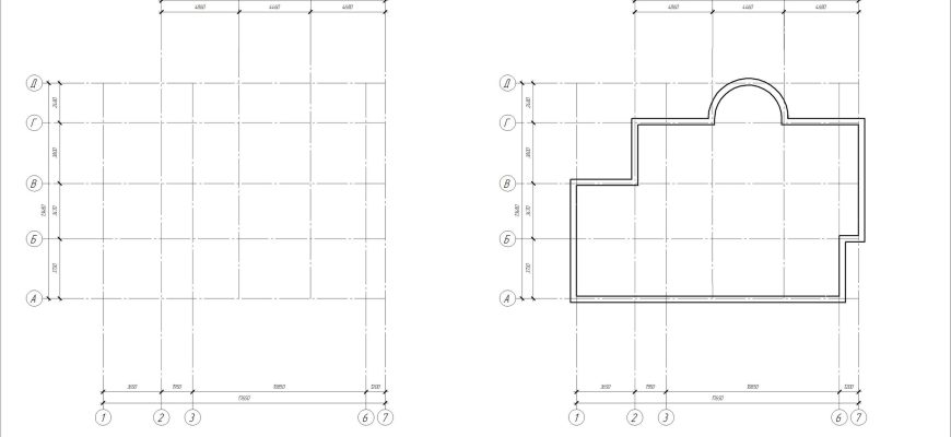 1. Нанести сетку осей. Оси выполнить тонкими штрихпунктирными линиями и обозначить марками в кружках диаметром 8-12 мм по левой и нижней сторонам плана здания. Размер шрифта для обозначения координационных осей выбрать на 1 — 2 номера больше, чем размер шрифта чисел.